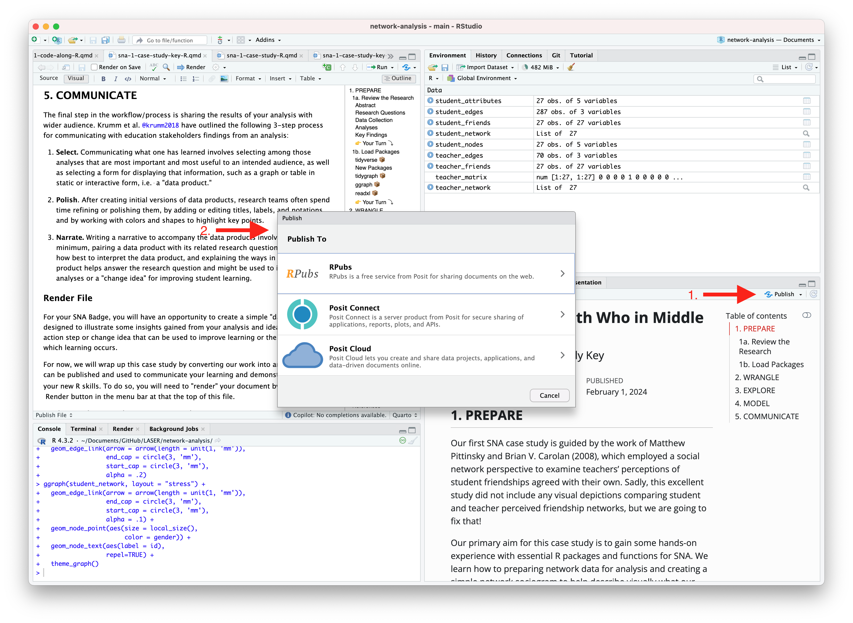 If you encounter errors when you try to render, first check the case study answer key located in the files pane and has the suggested code for the Your Turns. If you are still having difficulties, try copying and pasting the error into Google or ChatGPT to see if you can resolve the issue. Finally, contact your instructor to debug the code together if you’re still having issues.