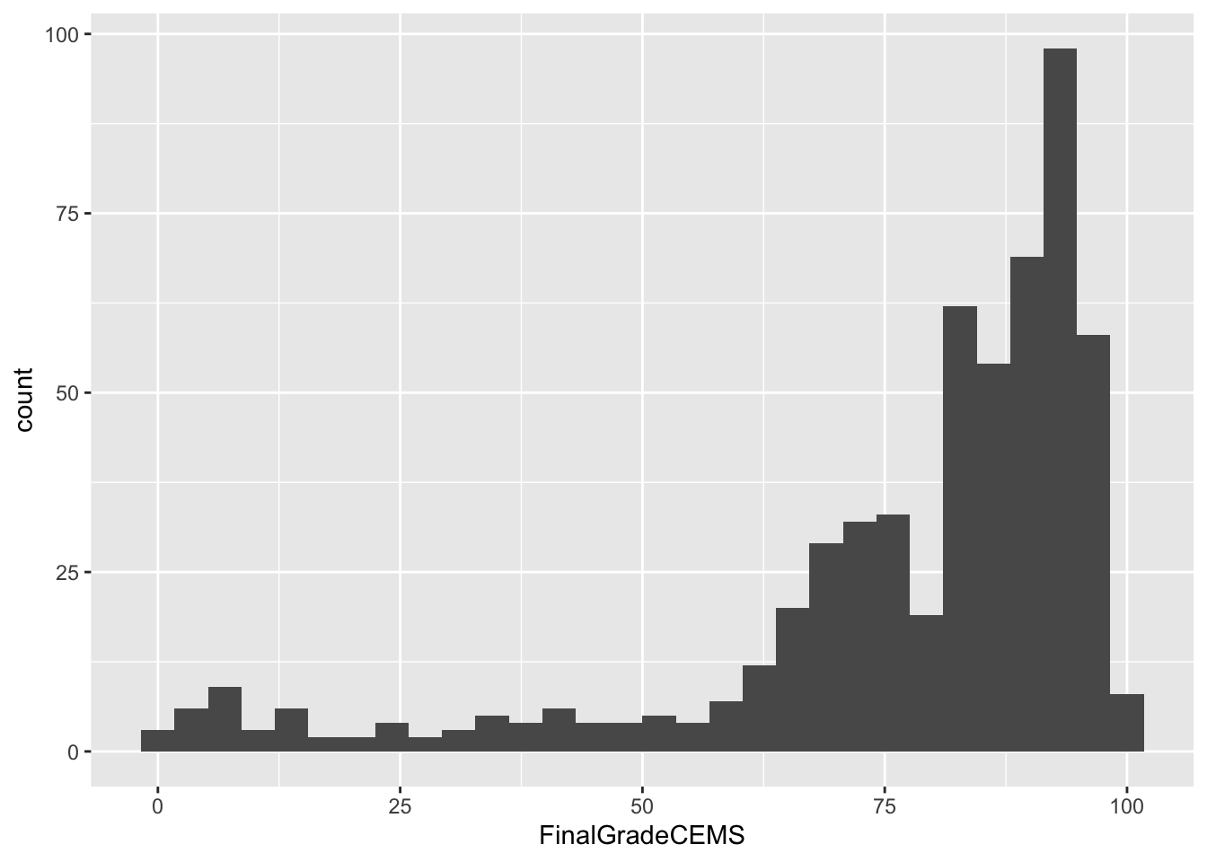 geom_histogram(aes(x = FinalGradeCEMS))`stat_bin()` using `bins = 30`. Pick better value with `binwidth`.