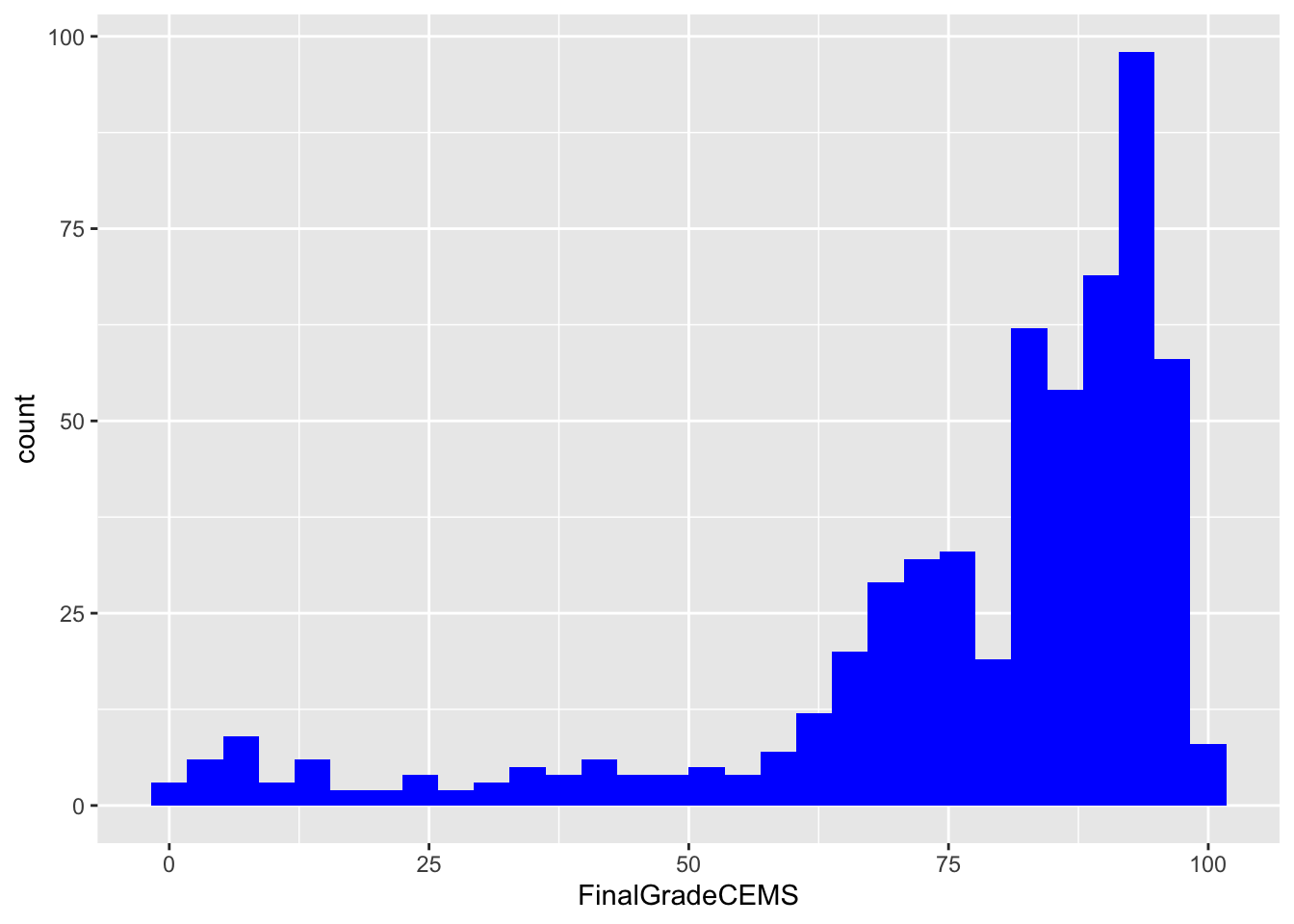 geom_histogram(aes(x = FinalGradeCEMS), fill = "blue")`stat_bin()` using `bins = 30`. Pick better value with `binwidth`.