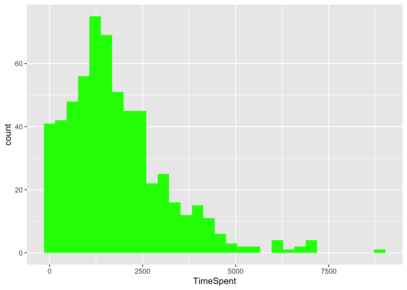 geom_histogram(aes(x = TimeSpent), fill = "green")`stat_bin()` using `bins = 30`. Pick better value with `binwidth`.