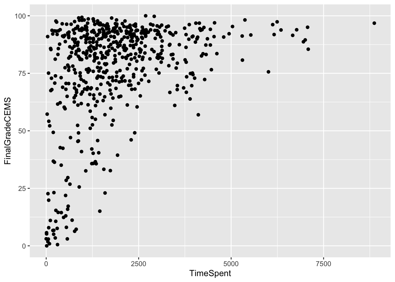 Complete the code chunk below to create a simple scatterplot with TimeSpent on the x axis and FinalGradeCEMS on the y axis. Hint: something else important is also missing that you will need to “add” to your code.